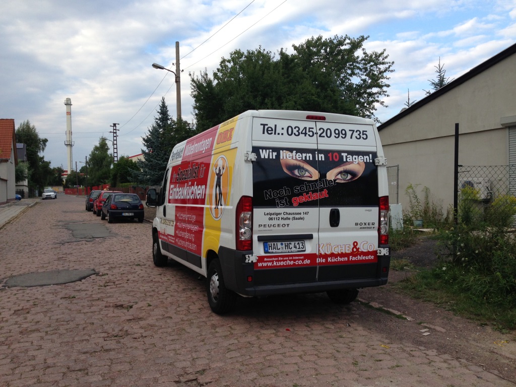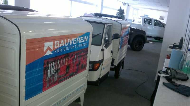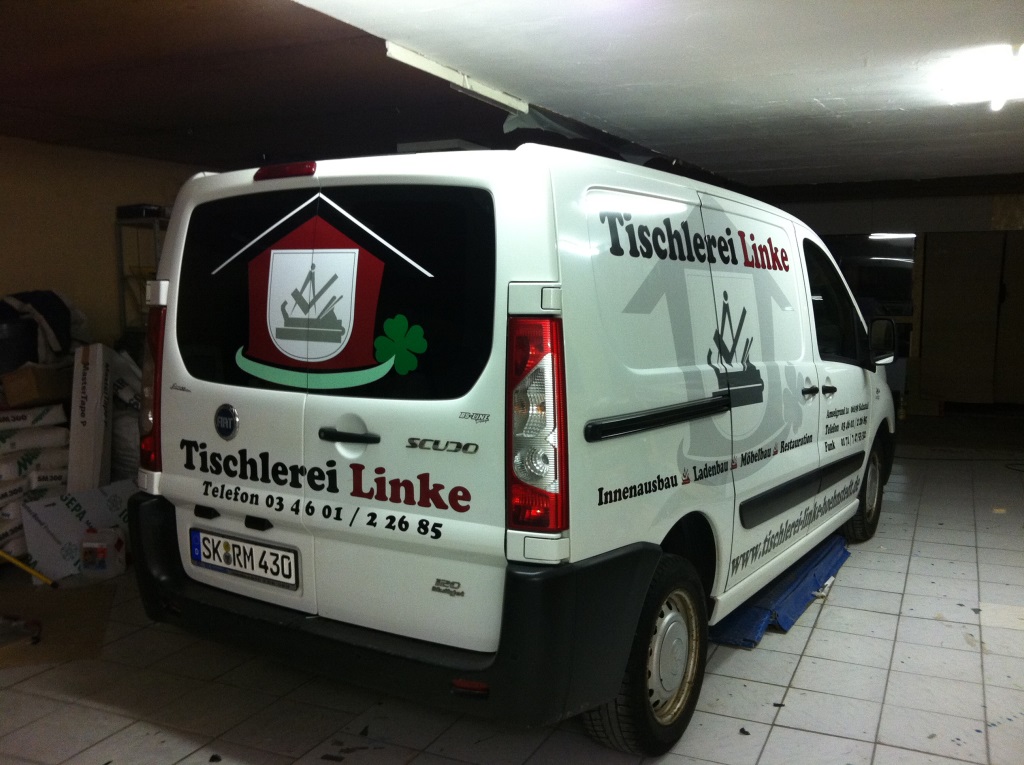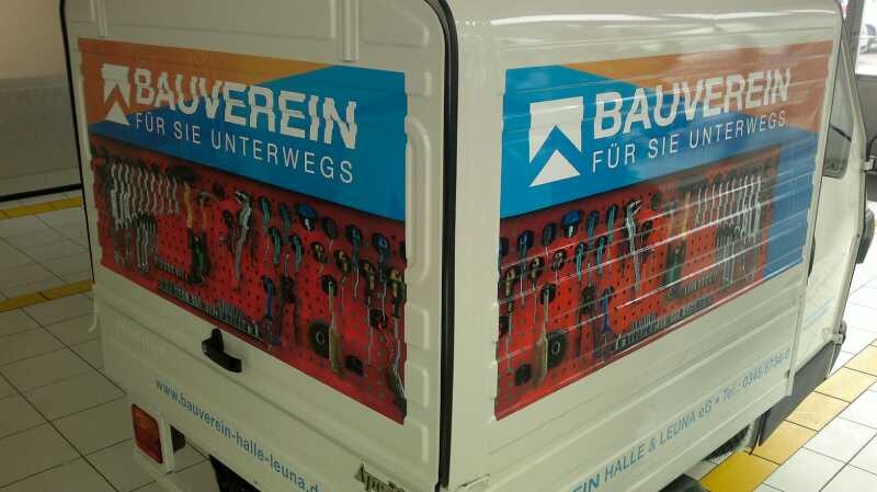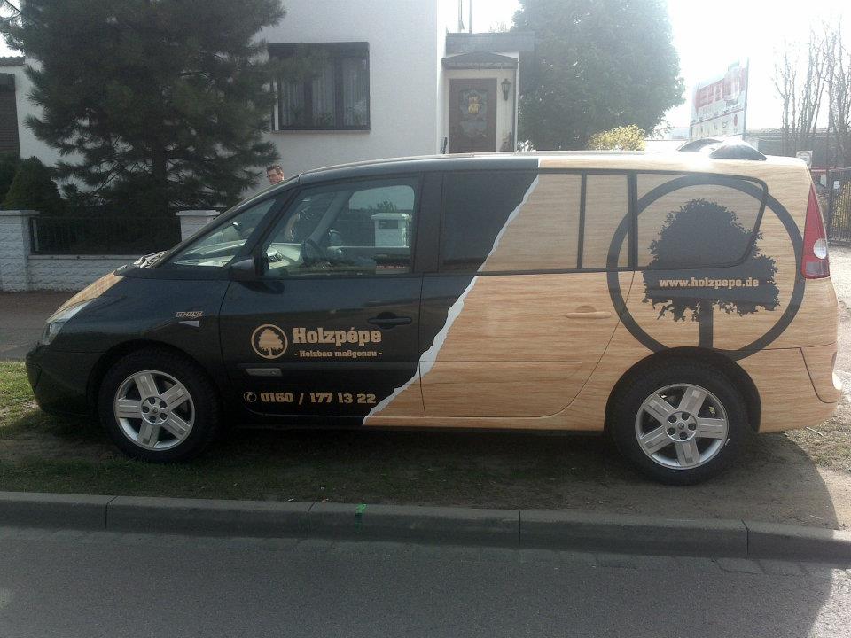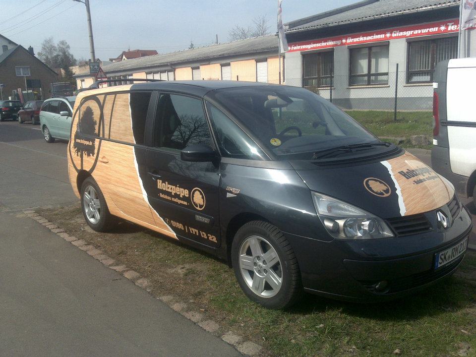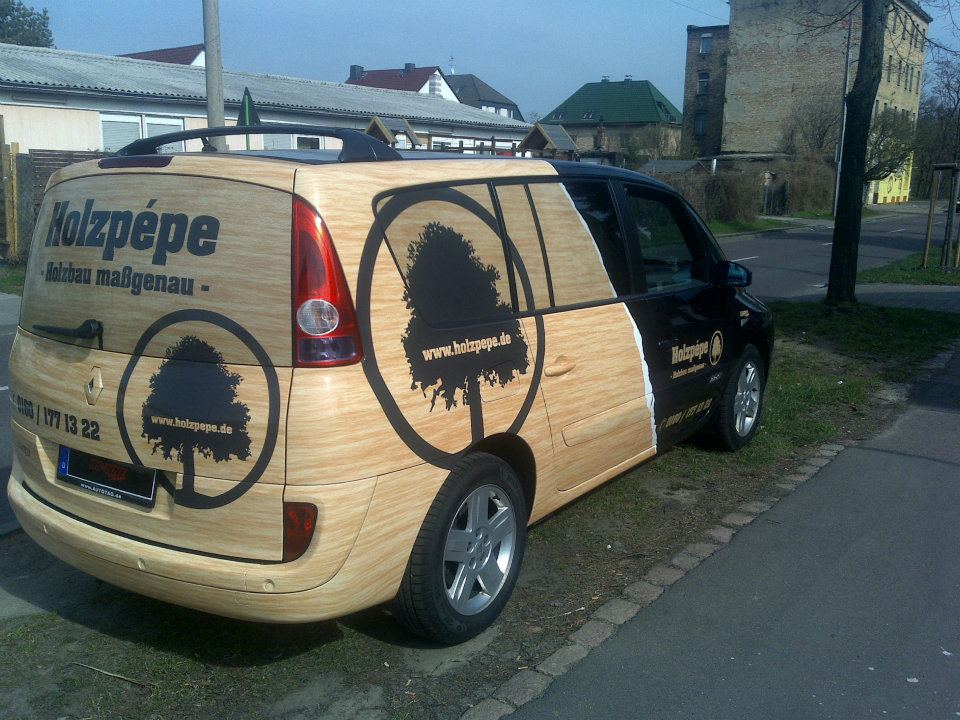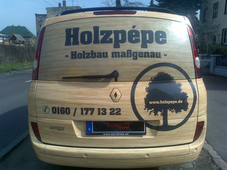 Fahrzeugbeschriftung für die Firma Holzpépe - Heck im Digitaldruck mit ORACAL3951RA foliert und Scheiben mit Windowsfolie beklebt.
